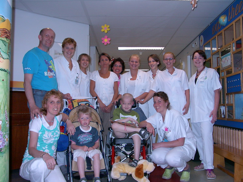 Donderdag 9 maart 2006: Jarno reageert steeds iets meer. Is wel onrustig, vandaag hielp zelfs snoezelen niet. De toestemming voor de chemo en bestraling is binnen. Hij krijgt 2x op een dag een dosis. Er is al een heel schema gemaakt. Wanneer ze beginnen is nog niet bekend. Vrijdag morgen vroeg wordt er die scan gemaakt van de bloedvaten naar de hersenen. Jarno heeft een speciale stoel gekregen /met wielen/ waar zijn hoofd goed gesteund in wordt. Die kan hij zelf nog niet rechthouden. Nu kan hij ook van de kamer af zonder dat Ron hem moet dragen. Vrijdagmorgen wordt de SPECT scan gemaakt in het Erasmus. Om 8.30 uur al ! Uitslag zal nog wel even op zich laten wachten ? Hierbij wordt dus de bloedtoevoer in de hersens bekeken en kan er mogelijk een prognose gemaakt worden over zijn herstel. De oncoloog kwam vertellen dat Jarno behandeld gaat worden met een methode van 2 x daags bestraling. De gedachte hieraan is, dat ’s ochtends een lage dosis straling gegeven wordt en ’s avonds nog eens een lage dosis. De bedoeling is dat gezonde cellen in die tussentijd al aardig hersteld zijn en kankercellen nog niet en door die 2e keer dan gedood worden. Dit betekend voor de langere duur dus minder beschadiging van de hersens, dus beter functioneren. Maar garanties geven ze niet. We hebben nog wat data doorgekregen voor vervolg: 16-3 intake gesprek, 21-3 masker aanmeten in Daniel de Hoed kliniek, 23-3 met masker een scan maken. Gisteren heeft hij een rolstoel gekregen van de fysio waarbij zijn hoofd ook goed ondersteund wordt, zodat hij ook eens uit het bed kan. Dus niet steeds in dezelfde houding hoeft te liggen. Hij heeft er een half uurtje in gelegen/gezeten en toen had hij er wel weer genoeg van. Hij was gisteren ook weer erg onrustig en lag veel te draaien en te huilen en te jammeren. Moeilijk als ouders om dat te zien en hem dan ook niet goed te kunnen troosten. Vandaag ging het iets beter, want na het douchen kwam de fysio weer, waarbij hij een knuffelpoes op zijn knieën kreeg (die hij had opgetrokken). De bedoeling was dat hij de poes op zijn plaats hield, maar natuurlijk gingen zijn benen opzij, waarbij de poes eraf viel. Toen wij daar leuk op reageerden moest hij lachen. Dit nog een paar keer herhaald, wat telkens lukte. Later nog met hem in de snoozelkamer gelegen (met de verschillende bewegende kleureffecten en lampen en geluiden), waarbij hij met een spelletje met mij weer moest lachen. Heerlijk om te zien. Eind van de middag weer erg onrustig en pas zojuist gaan slapen. Vrijwel heel de dag dus wakker geweest ! Wordt vervolgd.