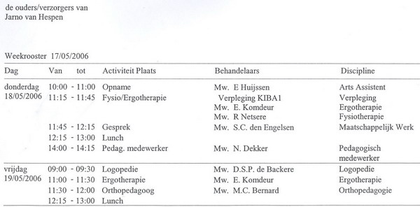 Dinsdag 7 maart 2006: Beste en lieve vrienden, Vandaag ook weer eens goed nieuws. De ruggepunctie die gisteren genomen is , is helemaal schoon, dus dat betekent geen zwaardere dosis bestraling/chemo. Vandaag gesprek gehad met de oncoloog, waarbij wij nu aangemeld worden voor de bestraling en chemo. Dit moet ingepland worden en zal binnen nu en 4 weken moeten gaan beginnen. Ook een gesprek gehad met een vrouwelijke neuro chirurg. Jarno krijgt nog een Spect-Scan. Met dit apparaat wordt de bloedtoevoer naar hersendelen zichtbaar gemaakt. Op deze manier kan je zien welke delen van de hersenen actiever zijn dan andere. Op die manier is mogelijk te voorspellen hoelang het duurt voor Jarno hersteld. Wel waarschuwde zij nog dat het mogelijk is dat niet alles hersteld. Dit kwam toch wel weer erg hard aan. Het is dus niet wanneer het hersteld, maar of het hersteld. Jarno is vandaag verder veel onrustig geweest en ook wij konden hem niet troosten (frustrerend). Na een aantal uurtjes was wel zijn bed helemaal nat van zijn plas, dus mogelijk zat die dwars. Daarna was hij namelijk rustiger. Vandaag wel 14 kaarten in 1 keer gekregen !!! Hartverwarmend. Jarno leek ook naar elke kaart te kijken. Ook genieten we nu ook al een paar dagen van een met liefde bereide maaltijd door moeders van school !!! Heerlijk. Liefs van ons